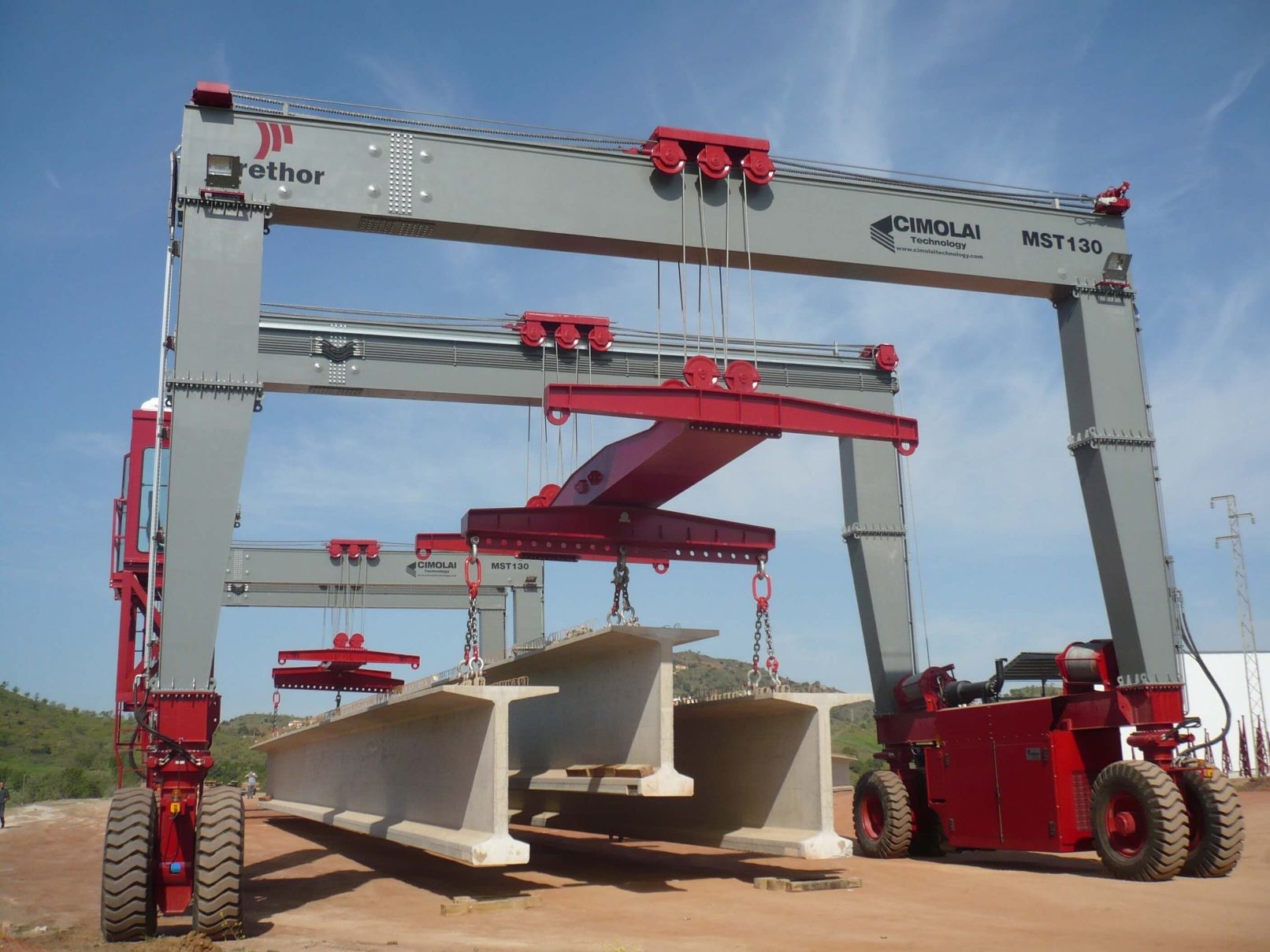 Mobile straddle transporter on tyres (two units) to handle and transport precast concrete beams and pillars.